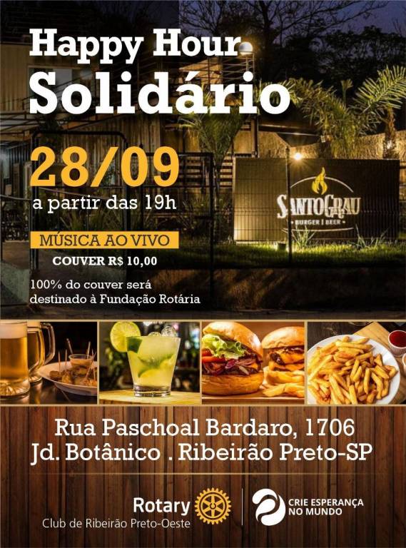 Na última sexta-feira, 28 de setembro, o Rotary Club de Ribeirão Preto Oeste realizou um emocionante Happy Hour Solidário no renomado Bar Santo Grau, cujo proprietário é um amigo próximo da Presidente do clube, Dora. O evento foi marcado por música ao vivo e um generoso gesto de solidariedade, com todo o couvert artístico destinado à doação em benefício da Fundação Rotária.